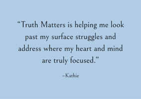 “Understanding my secure position in my Savior frees me to respond in every situation with confidence and love. The gospel changes how I see myself and how I respond to others. I don’t have to be defensive. I don’t have to be correct. I don’t have to be perfect. I am free from the tyranny of self-exaltation because I am in Christ Jesus. He is my security” (Truth Matters, Week Five).